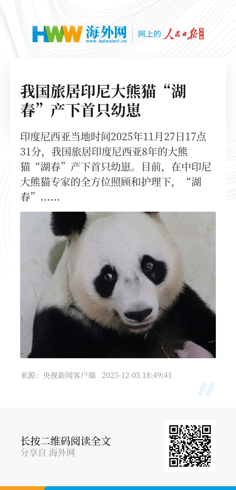 印度尼西亚当地时间2025年11月27日17点31分,我国旅居印度尼西亚8年的大熊猫“湖春”产下首只幼崽。目前,在中印尼大熊猫专家的全方位照顾和护理下,“湖春”及其雄性幼崽健康状况良好、状态平稳。