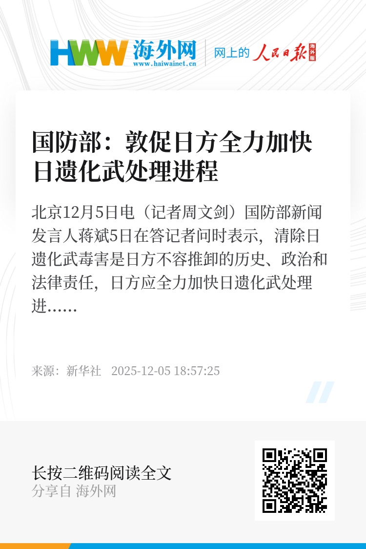 新华社北京12月5日电(记者周文剑)国防部新闻发言人蒋斌5日在答记者问时表示,清除日遗化武毒害是日方不容推卸的历史、政治和法律责任,日方应全力加快日遗化武处理进程。