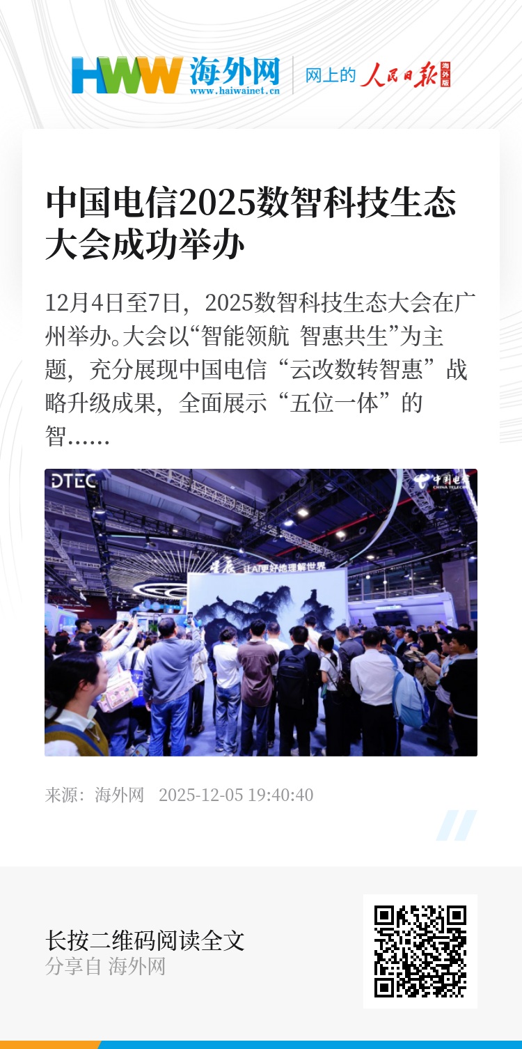 12月4日至7日,2025数智科技生态大会在广州举办。大会以“智能领航 智惠共生”为主题,充分展现中国电信“云改数转智惠”战略升级成果,全面展示“五位一体”的智能云体系技术突破与生态应用,吸引了千余名政企学界重要嘉宾齐聚羊城,共同聚焦人工智能与数智科技深度融合的前沿趋势,共话人工智能赋能产业变革的实践路径。在12月5日的大会主论坛上,广东省政府党组成员、副省长王胜,国家数据局党组成员、副局长余英出席并致辞,工业和信息化部总工程师钟志红视频致辞。中国电信董事长柯瑞文发表主旨演讲,总经理刘桂清发布《中国电信云网融合2035技术白皮书》。