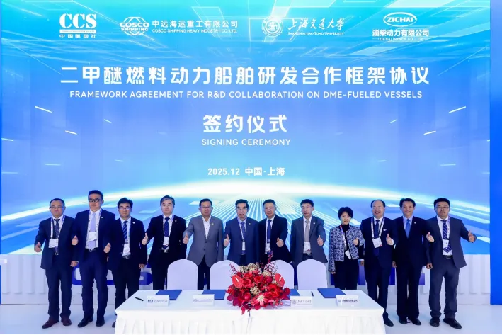 在国内首艘氨动力船舶航行实况暨中远海运重工氨动力科研专项成果发布会上,付国清见证了淄柴公司与中远海运重工、上海交通大学、中国船级社共同签署二甲醚燃料动力船舶研发框架协议。此次签约标志着集团在绿色船舶动力技术产业化方面迈出关键一步,为后续技术转化和产业应用奠定了坚实基础。