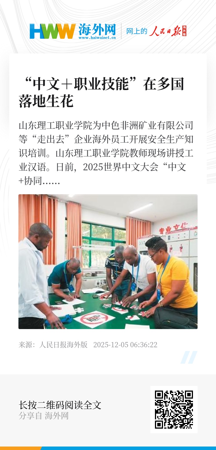 在校企深度协同实践的趋势中,山东理工职业学院选择嵌入企业,“借帆启航”。2018年,学校与泰国、澳大利亚等国的院校合作建设2所海外分校,积累国际化办学经验。在此基础上,山东理工职业学院与中国有色矿业集团有限公司、北方矿业有限责任公司等10余家企业建立深度合作关系,开办4所属地员工培训中心和中文工坊,为企业本土员工提供定制化培训,助力企业提升属地化运营能力。