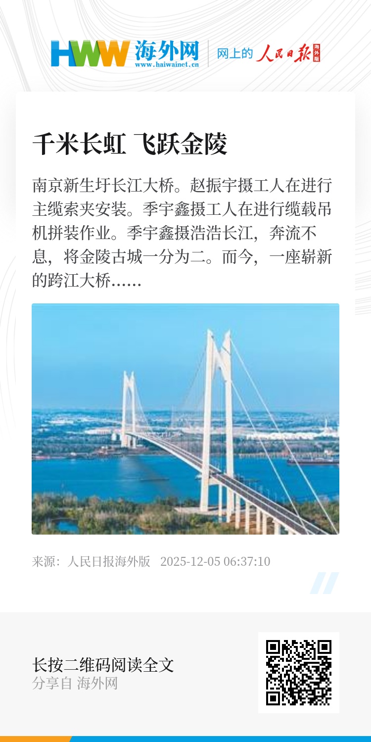 如今,新生圩长江大桥宛如一道璀璨的虹霓横跨江天。这座凝聚了无数建设者智慧与心血的世界级工程,不仅是南京迈向更高水平发展的有力见证,更是中国桥梁建设技术的又一飞跃,它用钢铁之躯架起城市发展的通途,以创新书写着中国基建的新传奇。(康朴 梁秋仪)