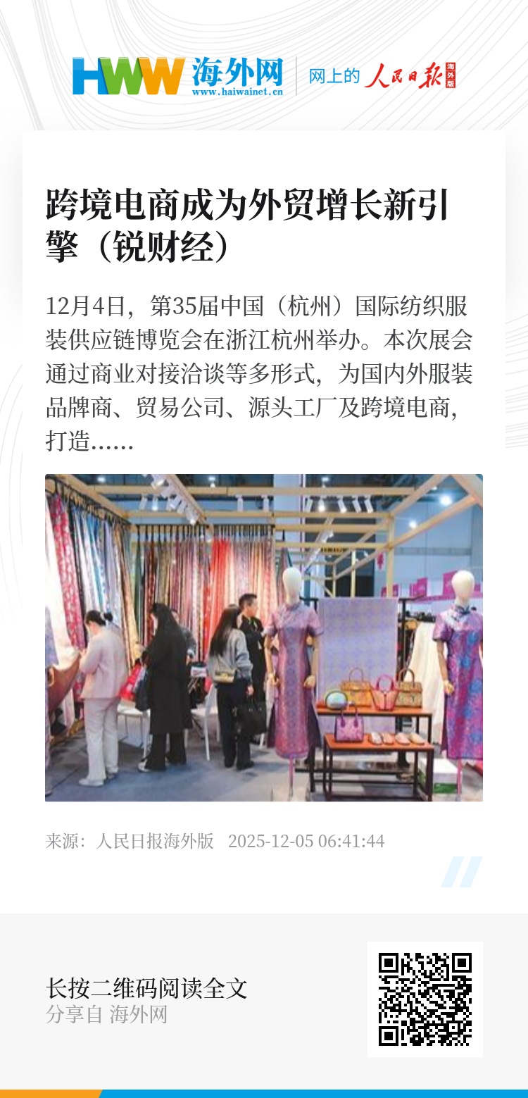12月4日,第35届中国(杭州)国际纺织服装供应链博览会在浙江杭州举办。本次展会通过商业对接洽谈等多形式,为国内外服装品牌商、贸易公司、源头工厂及跨境电商,打造一站式交流平台。连国庆摄(人民视觉)