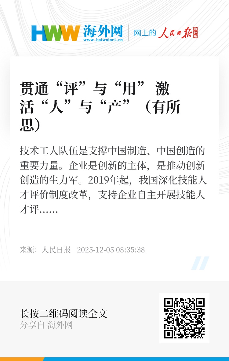 企业技能人才自主评价是一扇“窗”,开启了新视野,让劳动者看到职业发展的更多可能;是一条“路”,连接企业需求与人才培养,帮助员工找到自我提升、成长进步的清晰路径;更是一座“桥”,贯通产业与人才,推动要素协同、动能叠加,助推企业和产业高质量发展。(白光迪)