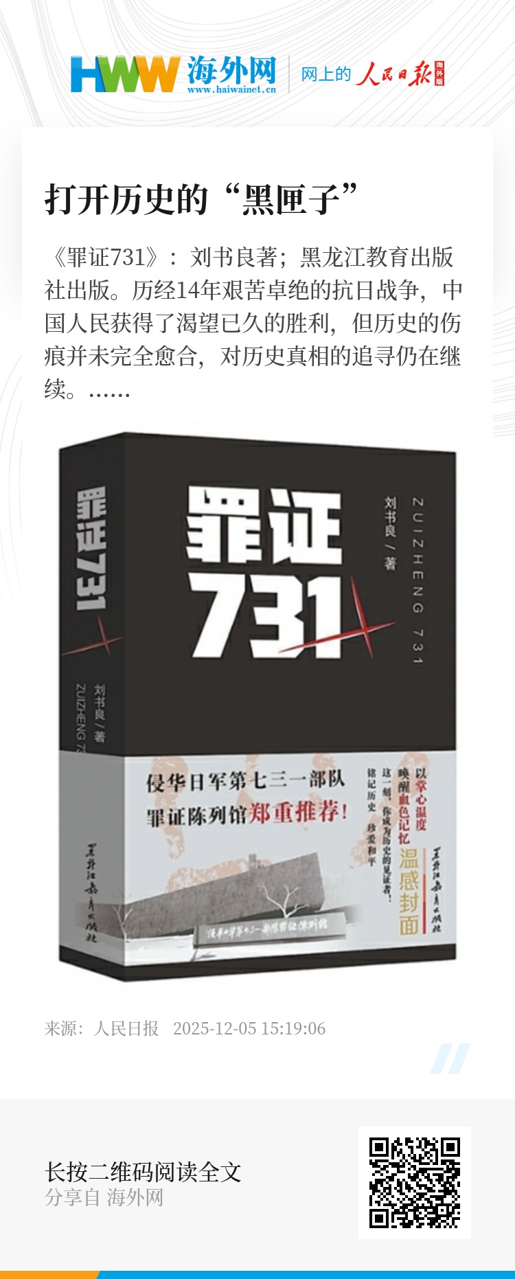 在被称为“黑匣子”的罪证陈列馆,我从一幅幅图片前走过,又去默读一幅幅图片下的文字。我被巨大的历史长卷裹挟着,投进没有一丝光点的黑幕中,恐惧是一堵沉重的黑墙,压得我喘不过气来,生出逃离窒息、逃离黑暗的冲动。那些尘封的记忆,如同被岁月磨砺的石头,外表斑驳,内里藏着无法磨灭的真相。这本《罪证731》,就是致敬那些以勇气和智慧揭开历史伤疤的人,那些为了正义和真相而不懈努力的人。(刘书良)