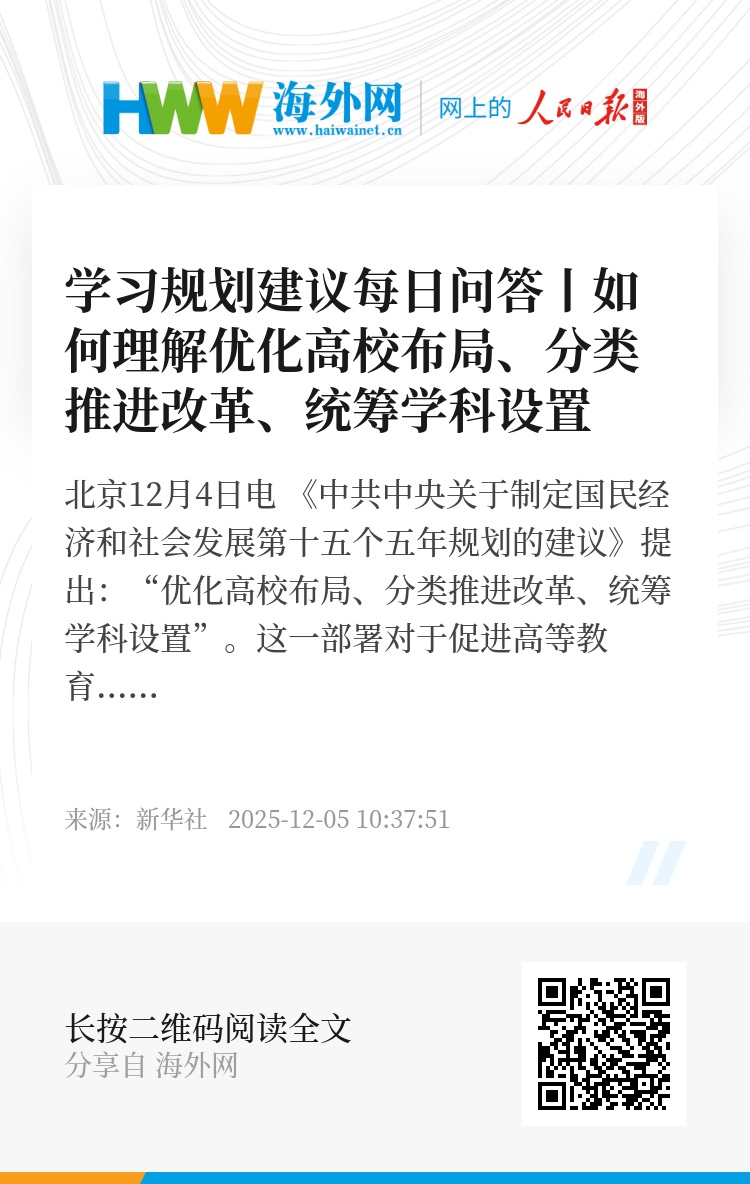 新华社北京12月4日电 《中共中央关于制定国民经济和社会发展第十五个五年规划的建议》提出:“优化高校布局、分类推进改革、统筹学科设置”。这一部署对于促进高等教育更好服务国家战略需要、适应经济社会发展要求,推动高校办出特色办出水平具有重要意义。