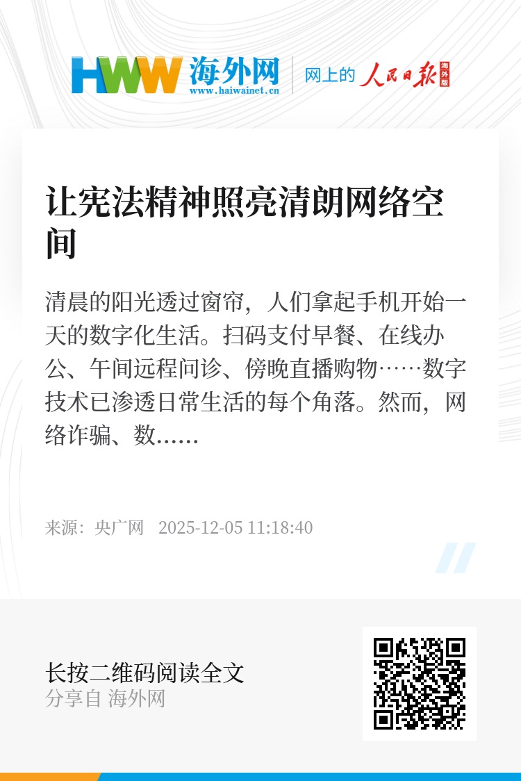法立于上,教弘于下。以宪法为核心的法治体系是数字文明健康发展的基石。让每一行代码闪耀公平正义的光芒,使每一次点击都获得尊严与安全的守护——良法善治将真正照亮数字生活,为构建网络强国、数字中国提供坚实保障。(央广网记者 费权)