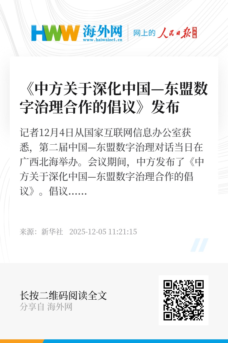 记者12月4日从国家互联网信息办公室获悉,第二届中国—东盟数字治理对话当日在广西北海举办。会议期间,中方发布了《中方关于深化中国—东盟数字治理合作的倡议》。