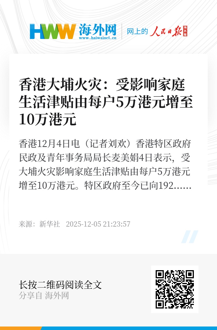 新华社香港12月4日电(记者刘欢)香港特区政府民政及青年事务局局长麦美娟4日表示,受大埔火灾影响家庭生活津贴由每户5万港元增至10万港元。