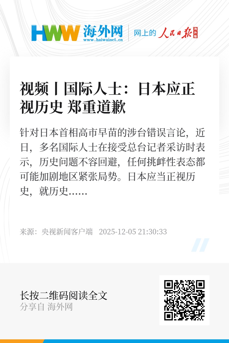针对日本首相高市早苗的涉台错误言论,近日,多名国际人士在接受总台记者采访时表示,历史问题不容回避,任何挑衅性表态都可能加剧地区紧张局势。日本应当正视历史,就历史罪行和错误言论郑重道歉。