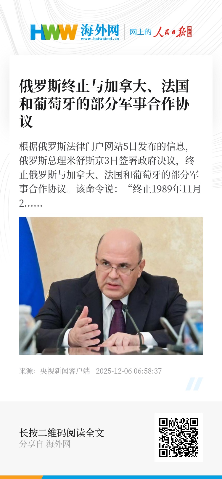 根据俄罗斯法律门户网站5日发布的信息,俄罗斯总理米舒斯京3日签署政府决议,终止俄罗斯与加拿大、法国和葡萄牙的部分军事合作协议。