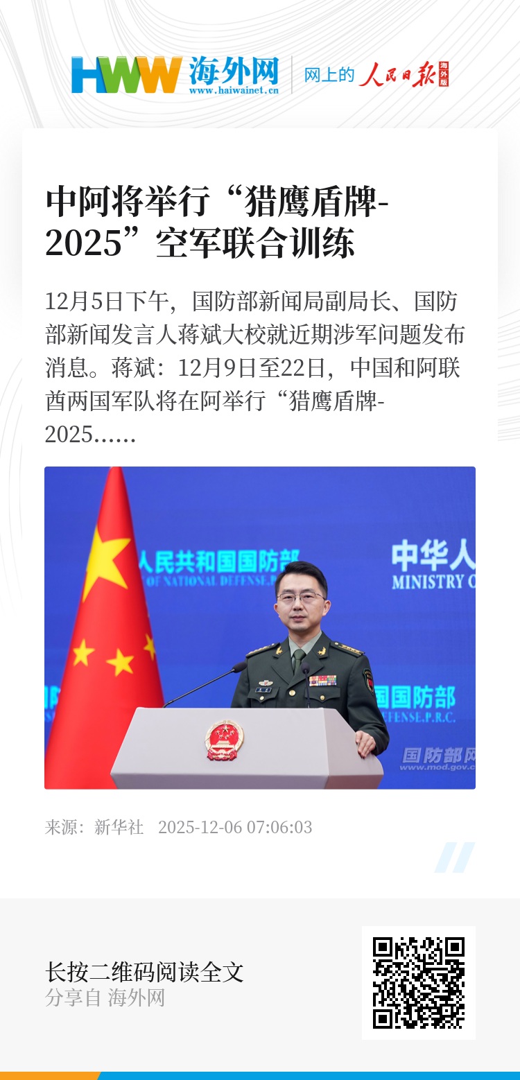蒋斌:12月9日至22日,中国和阿联酋两国军队将在阿举行“猎鹰盾牌-2025”空军联合训练。此系中阿两军第3次举行该系列联训,有助于两军加强互学互鉴,深化防务领域务实合作。