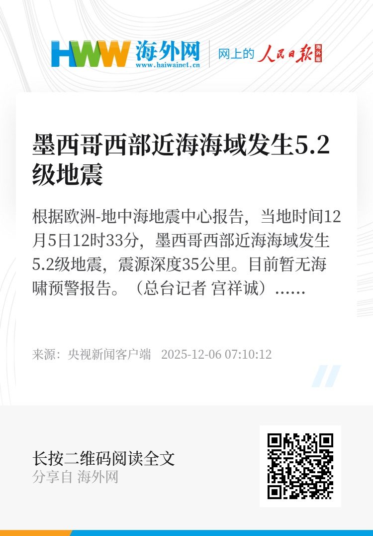 根据欧洲-地中海地震中心报告,当地时间12月5日12时33分,墨西哥西部近海海域发生5.2级地震,震源深度35公里。目前暂无海啸预警报告。(总台记者 宫祥诚)