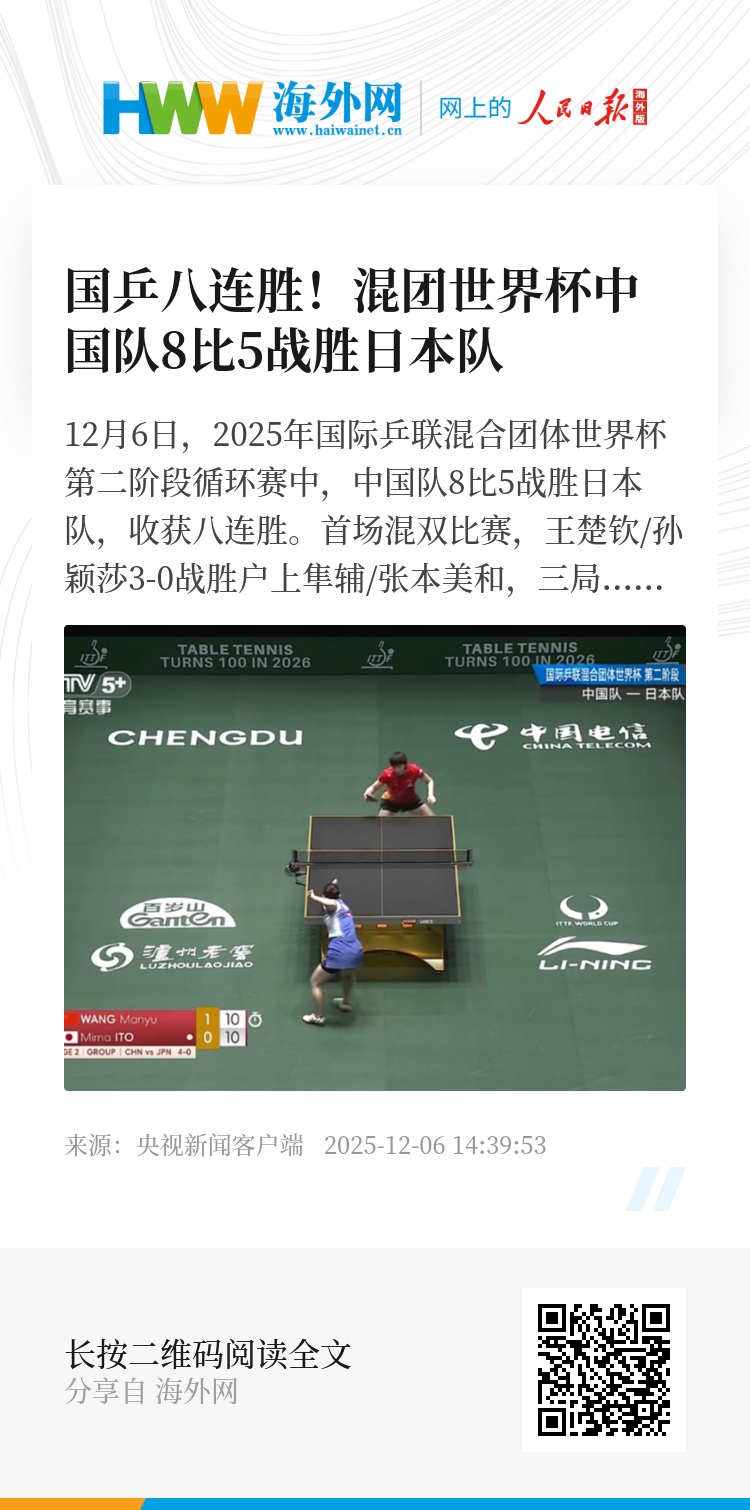 12月6日,2025年国际乒联混合团体世界杯第二阶段循环赛中,中国队8比5战胜日本队,收获八连胜。