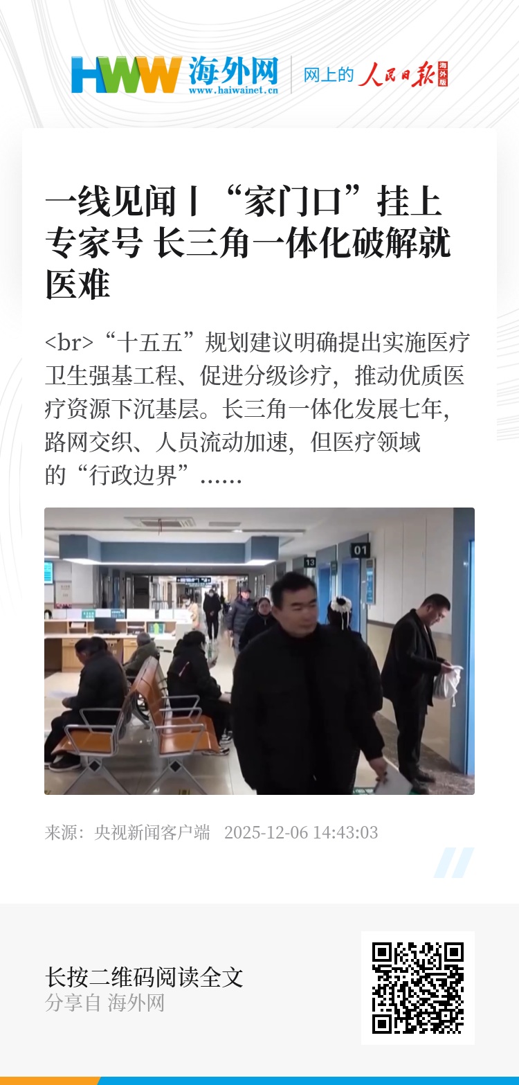 未来,随着“十五五”规划各项部署落地,长三角将持续以制度创新打破行政边界,以数智赋能提升服务效能,让公平可及、优质高效的健康服务惠及更多群众。