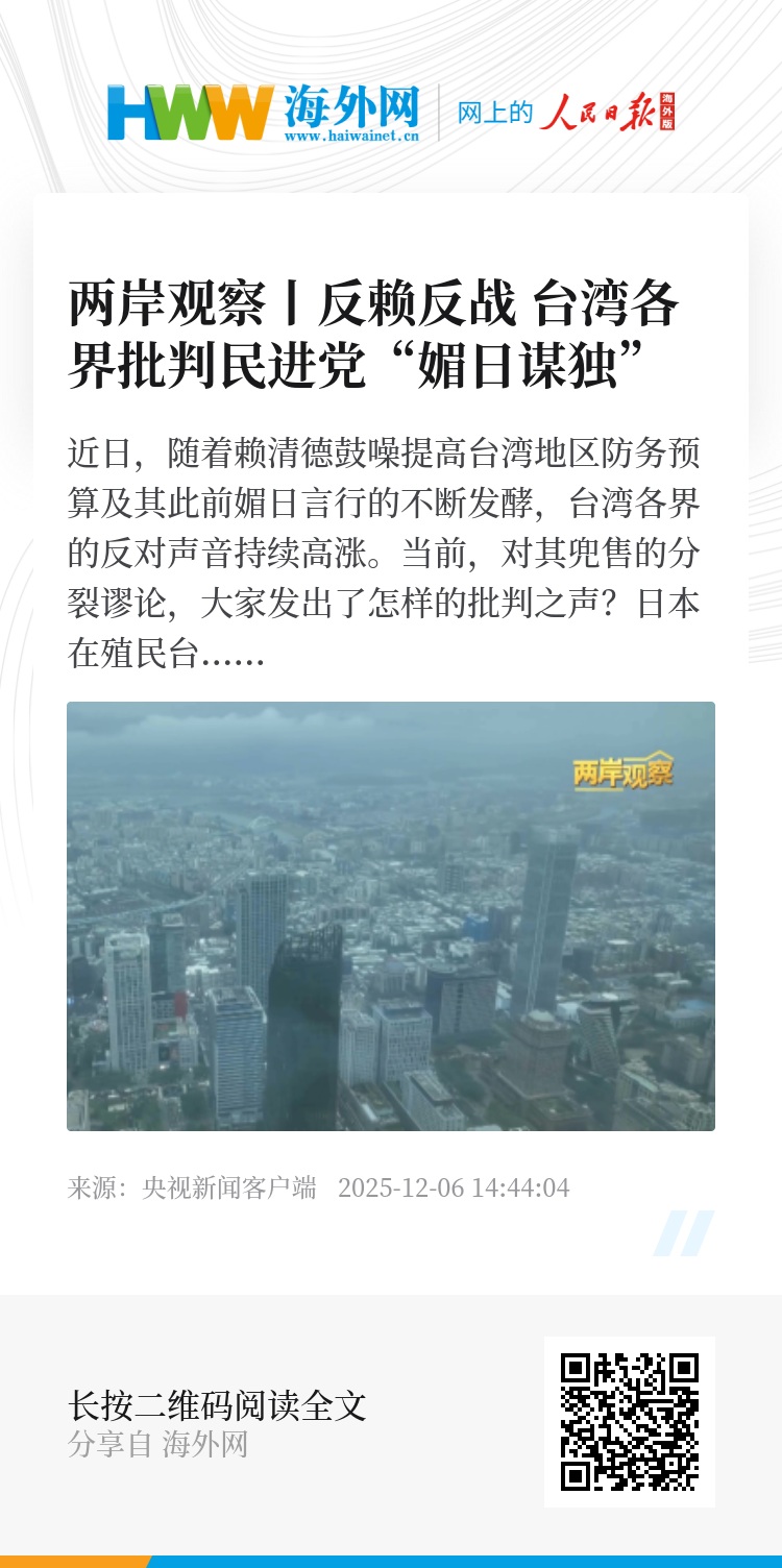 赖清德当局上台以来,屡屡违背岛内主流民意,岛内舆论多次批评,赖清德拿台湾人民血汗钱连连加码外部势力“保护费”。但其“倚外谋独”行径还不止如此。就在不久前,赖清德当局还充当起高市早苗“台湾有事就是日本有事”错误言论的“应声虫”,公然迎合日本试图武装介入台湾问题、阻挠中国统一大业的野心。