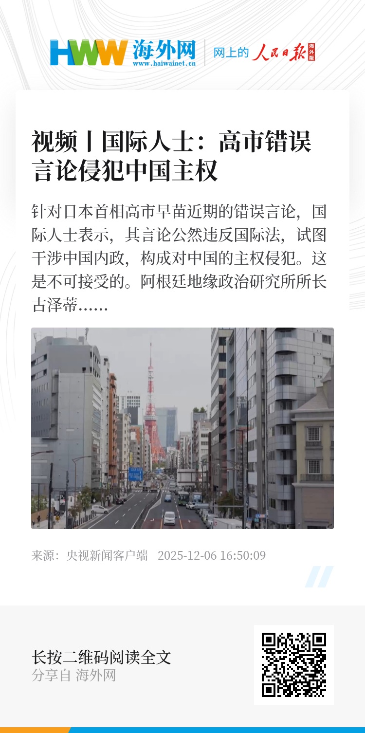 针对日本首相高市早苗近期的错误言论,国际人士表示,其言论公然违反国际法,试图干涉中国内政,构成对中国的主权侵犯。这是不可接受的。