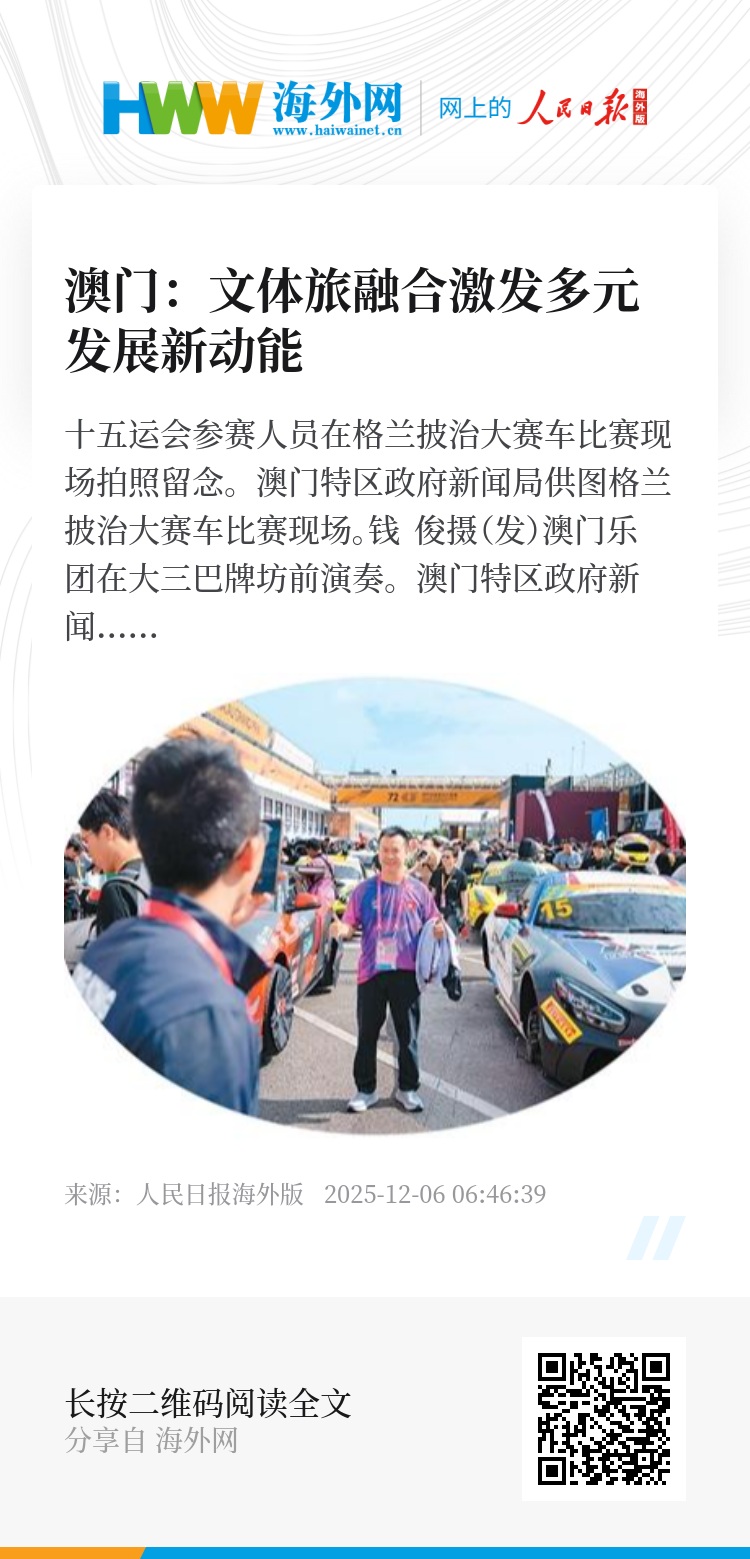 今年以来,澳门举办了乒乓球世界杯、国际龙舟赛等一系列大型体育赛事,并配合音乐节、美食节等精彩文旅活动,吸引游客来澳门游玩观赛。未来,澳门将积极参与大湾区体育合作,持续推动“体育+文化+旅游”深度融合,激发多元发展新动能。
