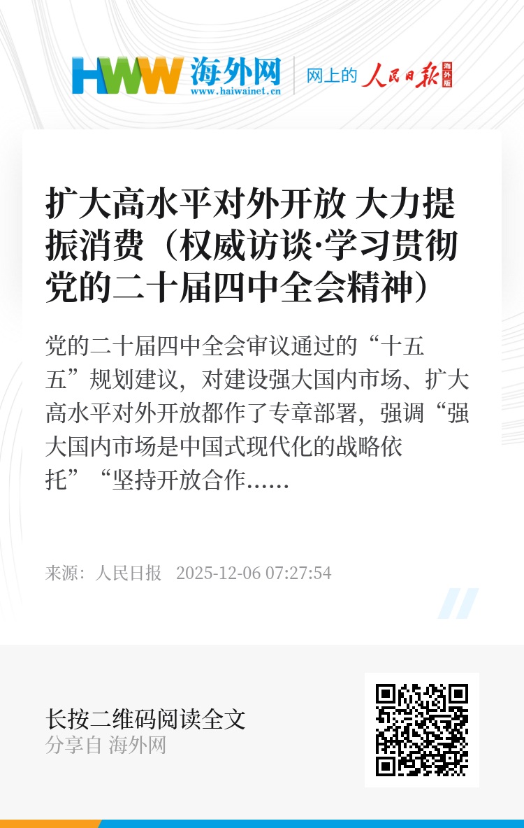 王文涛:习近平总书记强调,过去我们的开放是“跟跑”,现在我们的开放是要“领跑”。“十五五”规划建议对扩大高水平对外开放作了专章部署,体现了以习近平同志为核心的党中央对开放工作的高度重视,释放了中国坚持开放合作、互利共赢的强烈信号。“十五五”时期是基本实现社会主义现代化夯实基础、全面发力的关键时期,对内以开放促改革促发展,对外以开放促合作促共赢,具有重要意义。