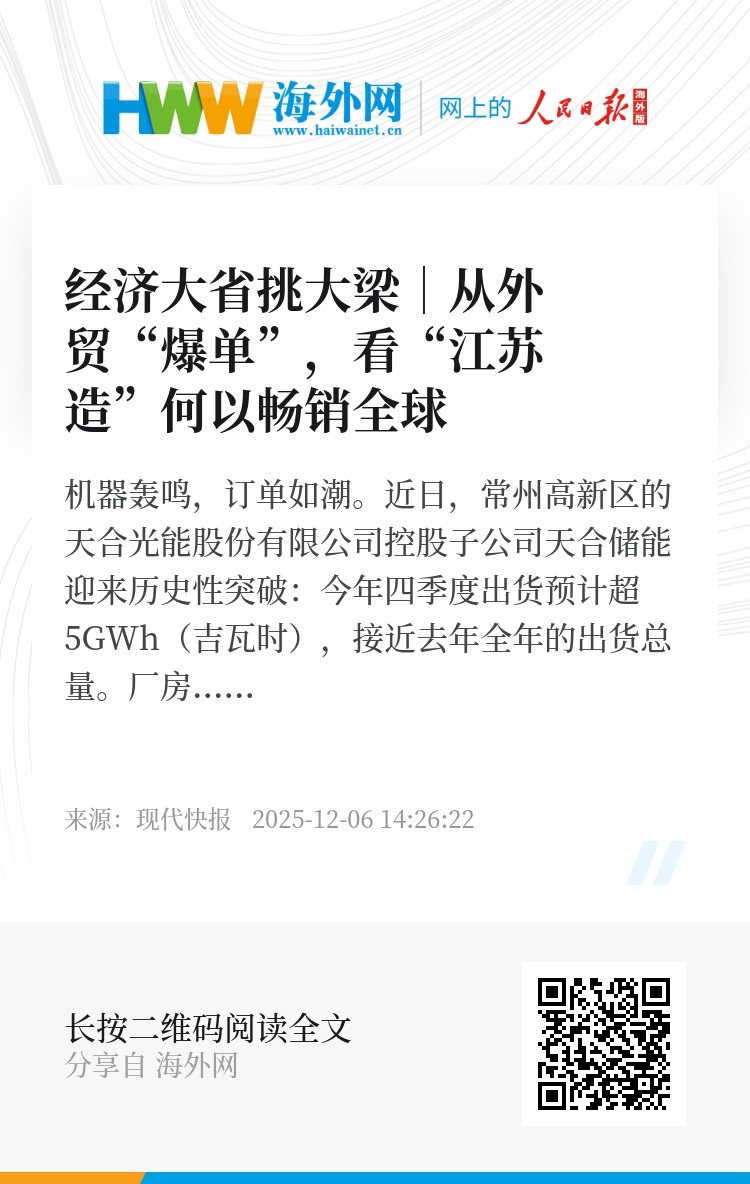 机器轰鸣,订单如潮。近日,常州高新区的天合光能股份有限公司控股子公司天合储能迎来历史性突破:今年四季度出货预计超5GWh(吉瓦时),接近去年全年的出货总量。厂房里生产线高速运转,港口边桥吊如林,远洋巨轮载货驶向远方——这般火热的“爆单”场景,正频频在江苏大地上演,成为中国外贸发展活力的缩影。