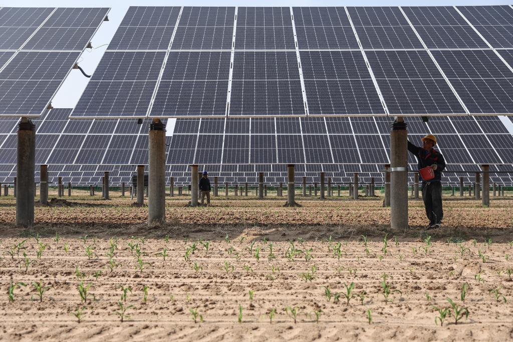 2025年5月29日,工作人员在辽宁彰武县章古台镇光伏+治沙生态产业项目现场对光伏板进行维护。新华社记者 潘昱龙 摄