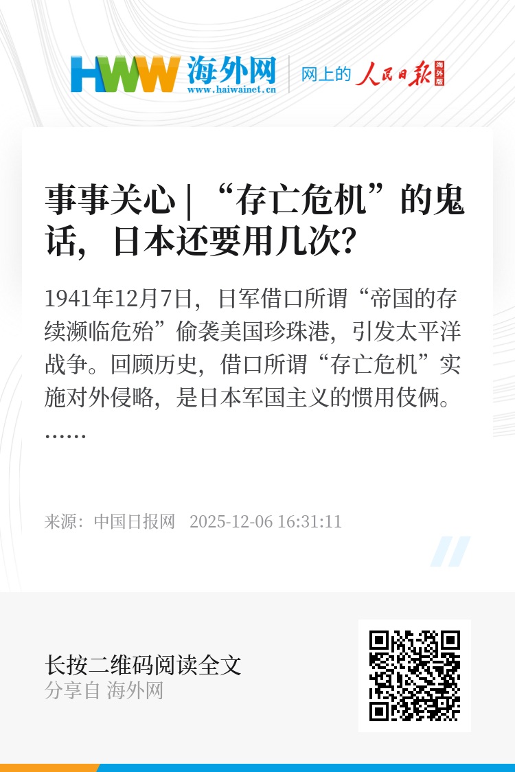 回顾历史,借口所谓“存亡危机”实施对外侵略,是日本军国主义的惯用伎俩。1931年,日本侵略者将“能否得到满洲”视为“威胁日本存亡”的重大问题,悍然发动“九一八”事变,进而侵占中国东北;1937年发动全面侵华时则声称“中国事态已威胁日本存亡”。