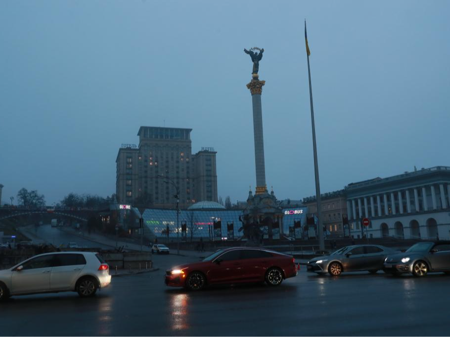 2025年11月20日,乌克兰首都基辅主要街道的照明设施出现大面积停电,车辆在暮色中驶过独立广场。新华社记者李东旭摄