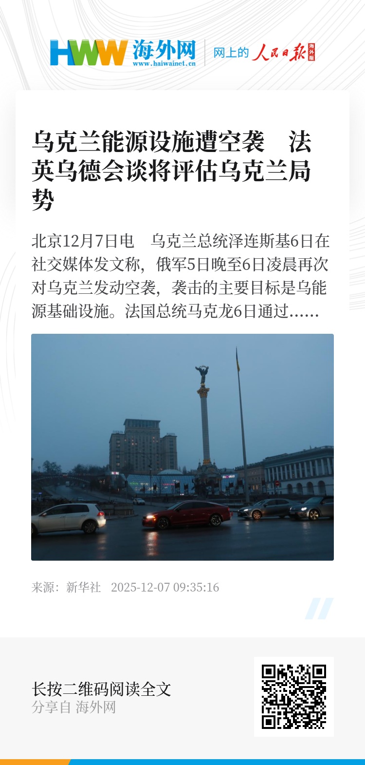 新华社北京12月7日电 乌克兰总统泽连斯基6日在社交媒体发文称,俄军5日晚至6日凌晨再次对乌克兰发动空袭,袭击的主要目标是乌能源基础设施。