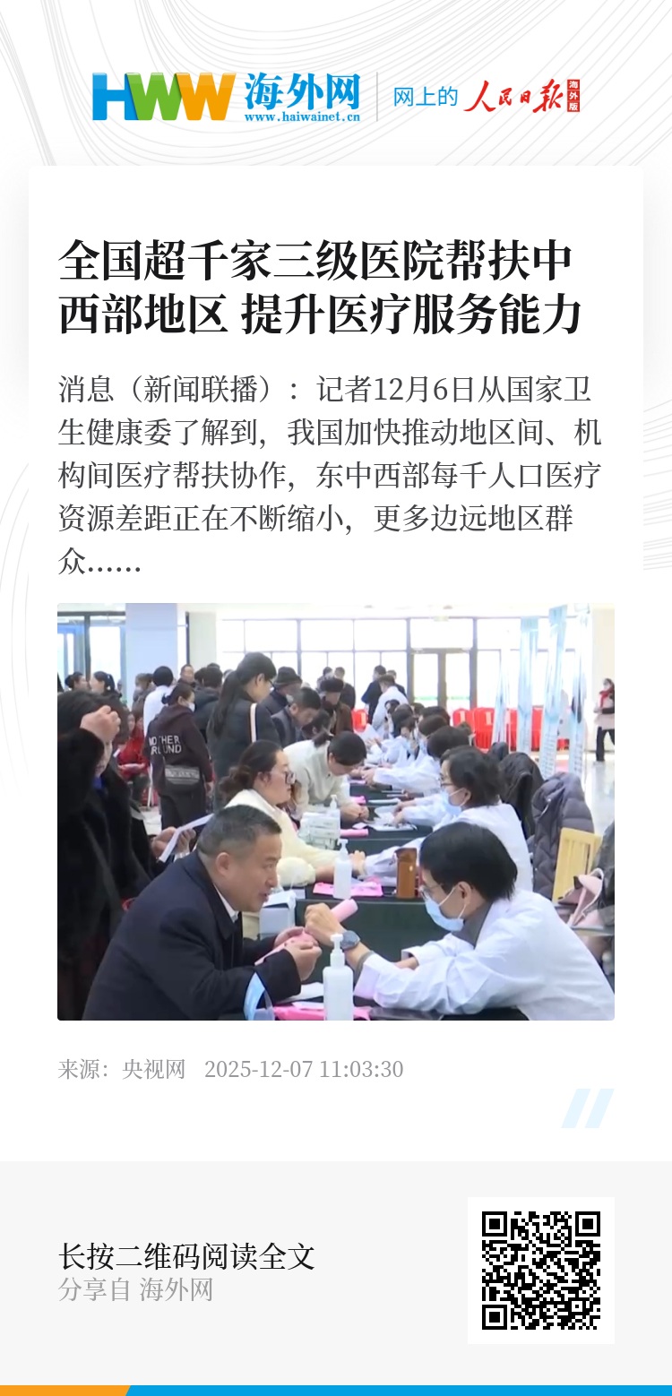 央视网消息(新闻联播):记者12月6日从国家卫生健康委了解到,我国加快推动地区间、机构间医疗帮扶协作,东中西部每千人口医疗资源差距正在不断缩小,更多边远地区群众在家门口得到了便捷、优质的健康服务。