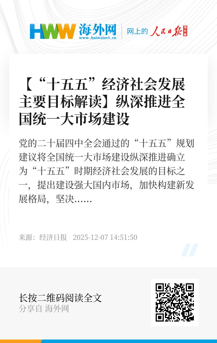 党的二十届四中全会通过的“十五五”规划建议将全国统一大市场建设纵深推进确立为“十五五”时期经济社会发展的目标之一,提出建设强大国内市场,加快构建新发展格局,坚决破除阻碍全国统一大市场建设卡点堵点。