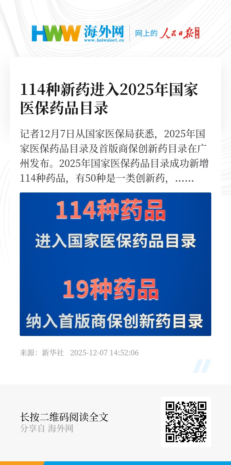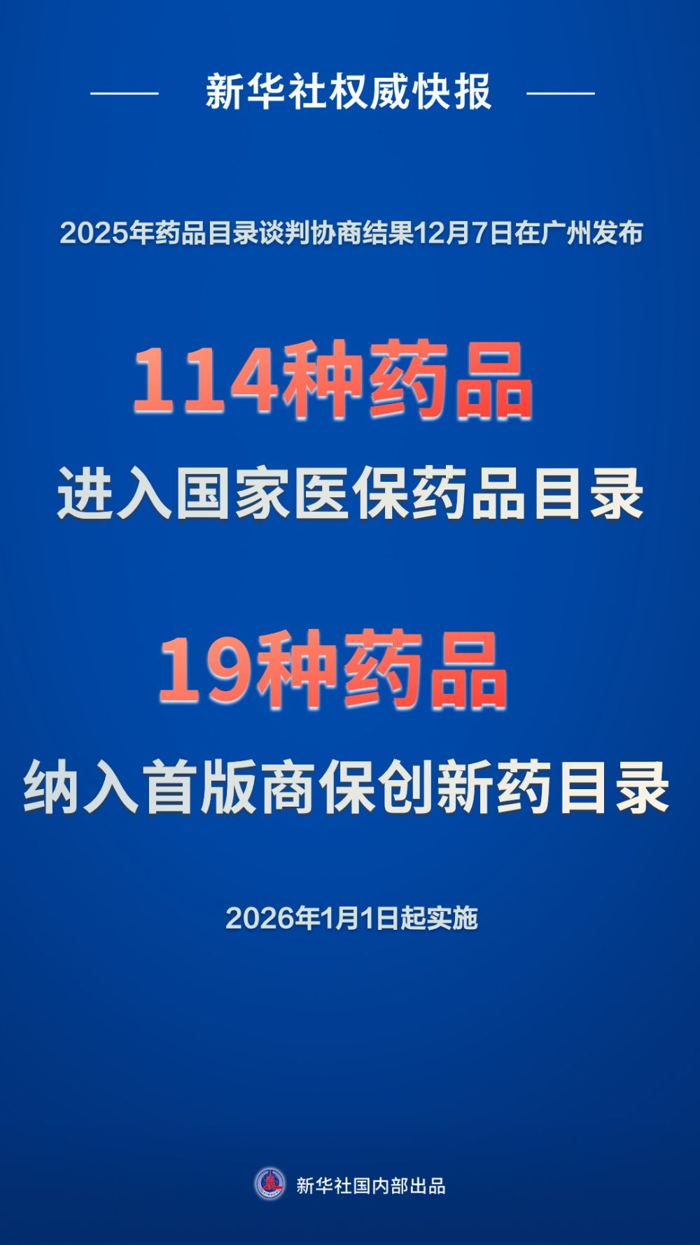 记者12月7日从国家医保局获悉,2025年国家医保药品目录及首版商保创新药目录在广州发布。2025年国家医保药品目录成功新增114种药品,有50种是一类创新药,总体成功率88%,较2024年的76%明显提高。19种药品纳入首版商保创新药目录。