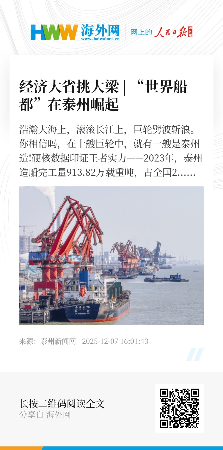2023年,泰州造船完工量913.82万载重吨,占全国21.6%、全球10.85%;2024年再攀高峰,以1030万载重吨的成绩占据全球11.9%的份额。泰州已崛起成为全国最大民营造船基地、国家级船舶出口基地,造船完工量连续多年高居全国地级市榜首。
