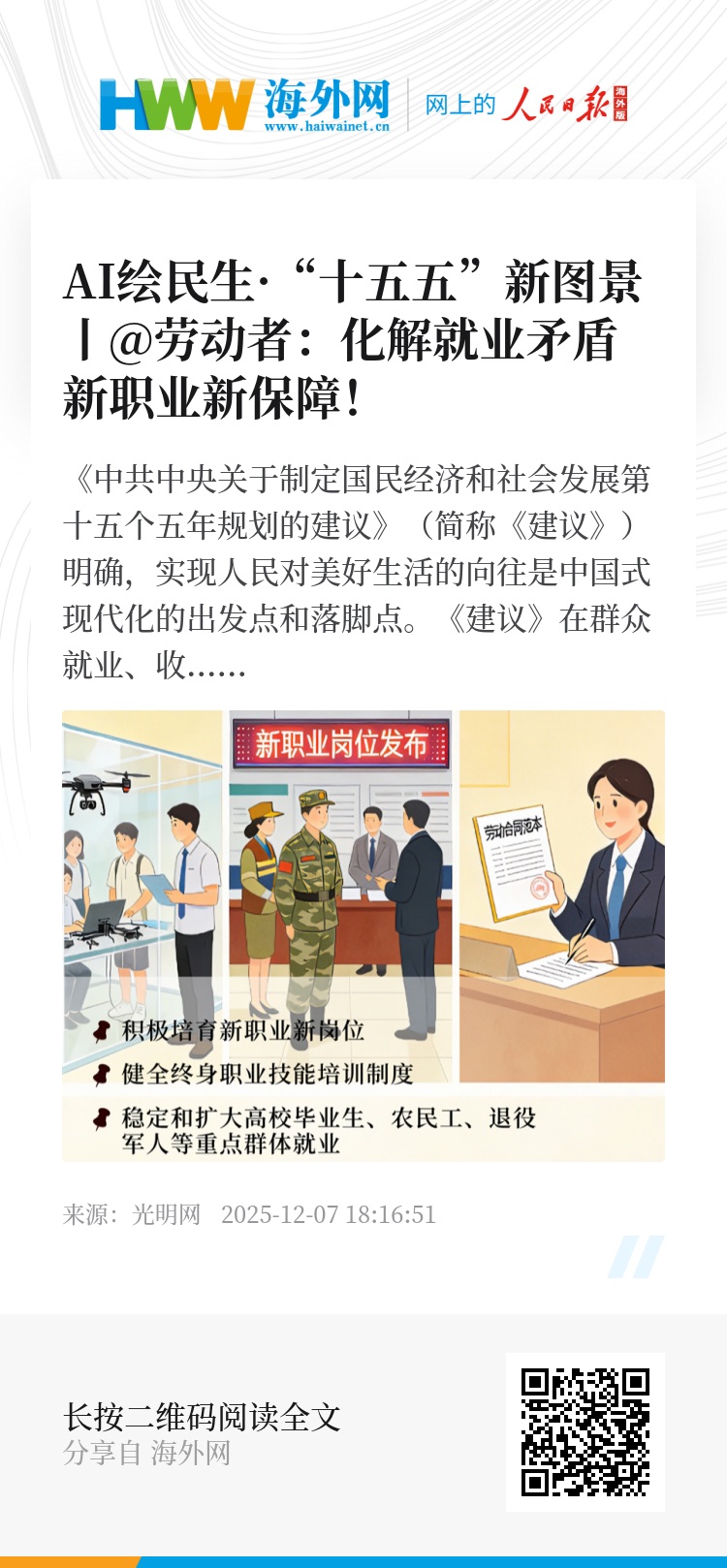 《中共中央关于制定国民经济和社会发展第十五个五年规划的建议》(简称《建议》)明确,实现人民对美好生活的向往是中国式现代化的出发点和落脚点。《建议》在群众就业、收入、教育、社保等民生领域提出一系列举措。从年轻人求职到老年人养老,从孩子教育到家庭医疗,这些民生红利让发展成果可以更多更公平地惠及民众。