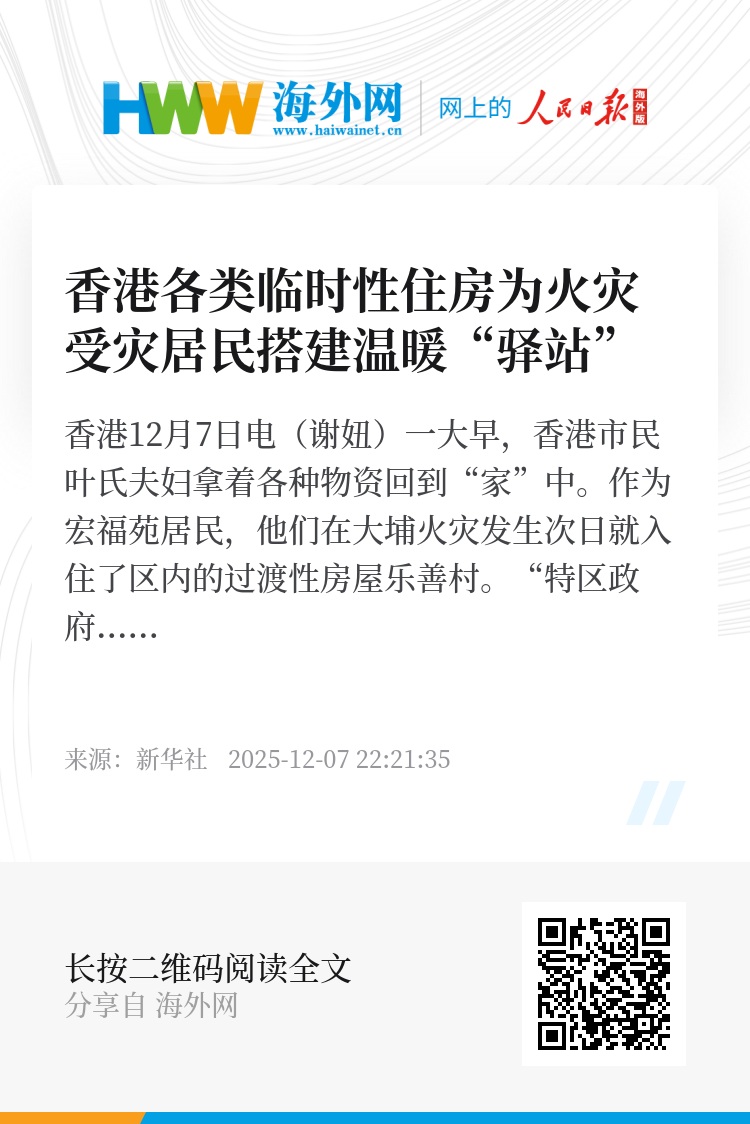 新华社香港12月7日电(谢妞)一大早,香港市民叶氏夫妇拿着各种物资回到“家”中。作为宏福苑居民,他们在大埔火灾发生次日就入住了区内的过渡性房屋乐善村。“特区政府很快就安排我们入住过渡性房屋,心情渐渐安定下来。”叶太说。