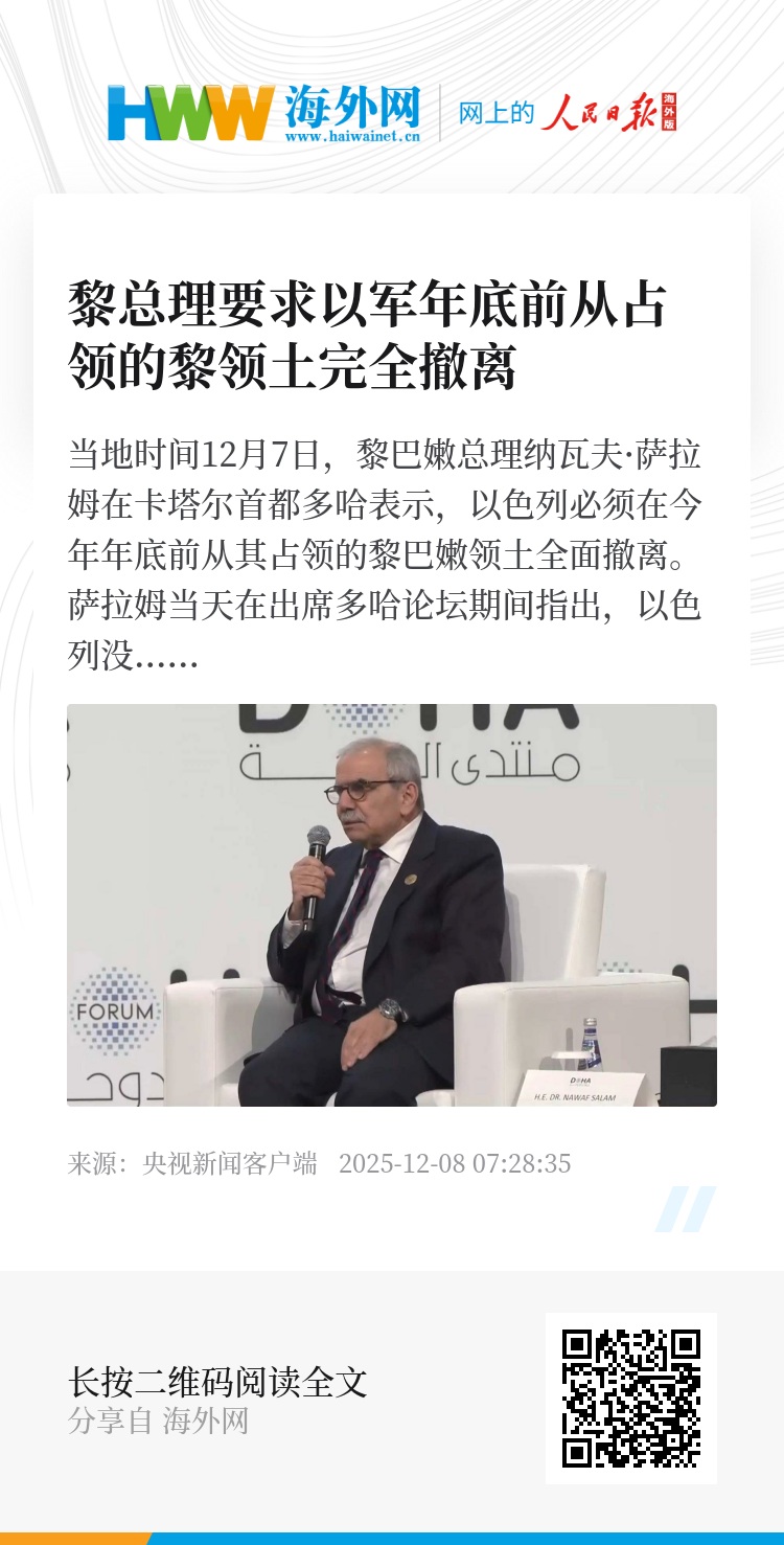 当地时间12月7日,黎巴嫩总理纳瓦夫·萨拉姆在卡塔尔首都多哈表示,以色列必须在今年年底前从其占领的黎巴嫩领土全面撤离。