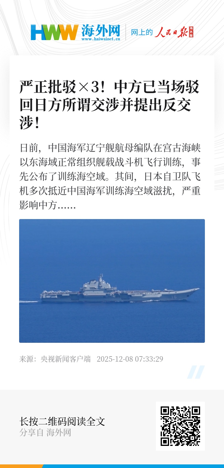 中国人民解放军海军新闻发言人王学猛海军大校表示,日方有关炒作与事实完全不符,我们严正要求日方立即停止污蔑抹黑,严格约束一线行动。中国海军将依法采取必要措施,坚决维护自身安全和合法权益。