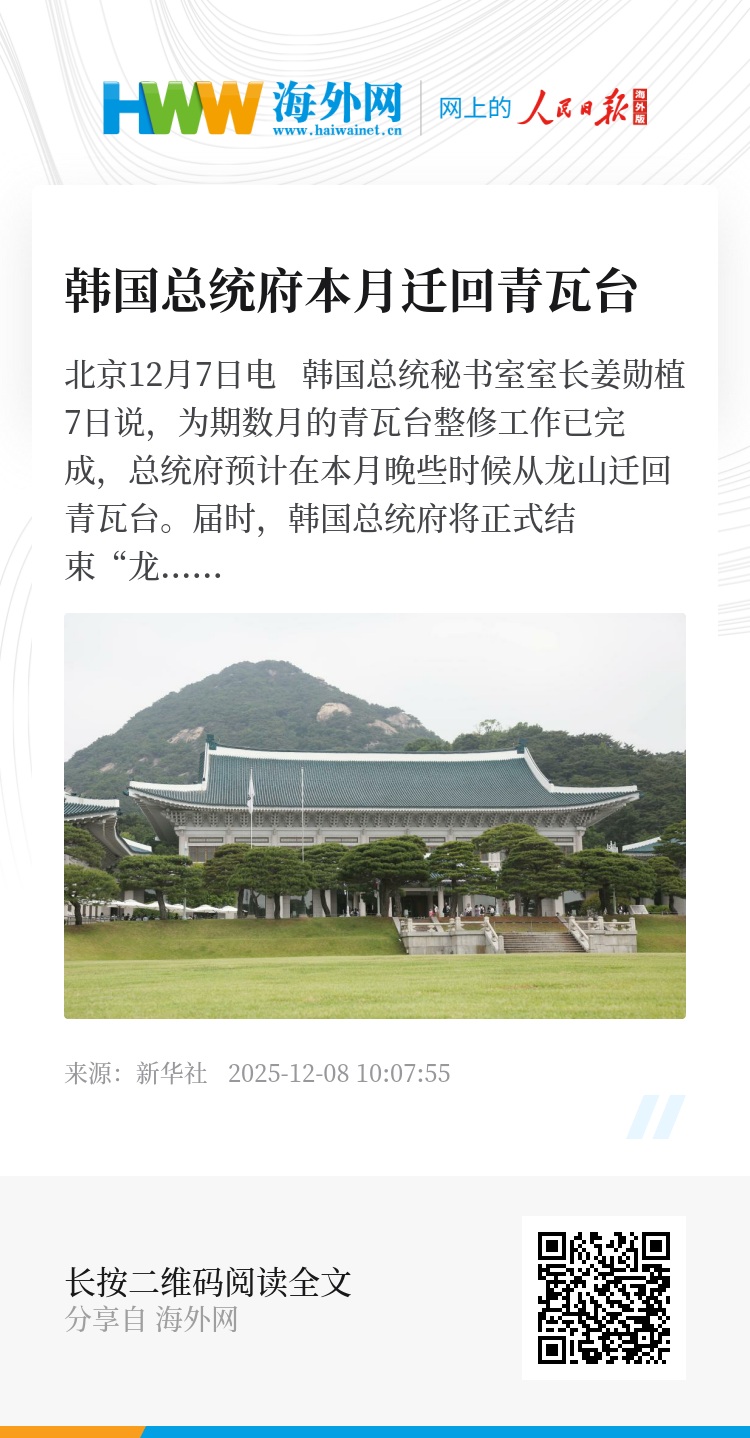 新华社北京12月7日电 韩国总统秘书室室长姜勋植7日说,为期数月的青瓦台整修工作已完成,总统府预计在本月晚些时候从龙山迁回青瓦台。届时,韩国总统府将正式结束“龙山时代”。