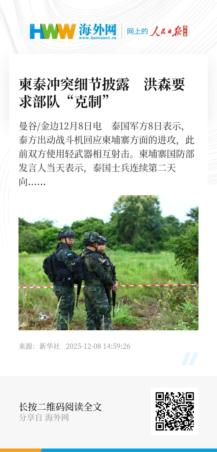 洪森8日在其官方社交媒体账号上发帖说,“所有一线部队必须保持耐心,因为侵略者从12月7日开始,包括昨晚和今天早上,一直在使用各种武器向我们开火。”