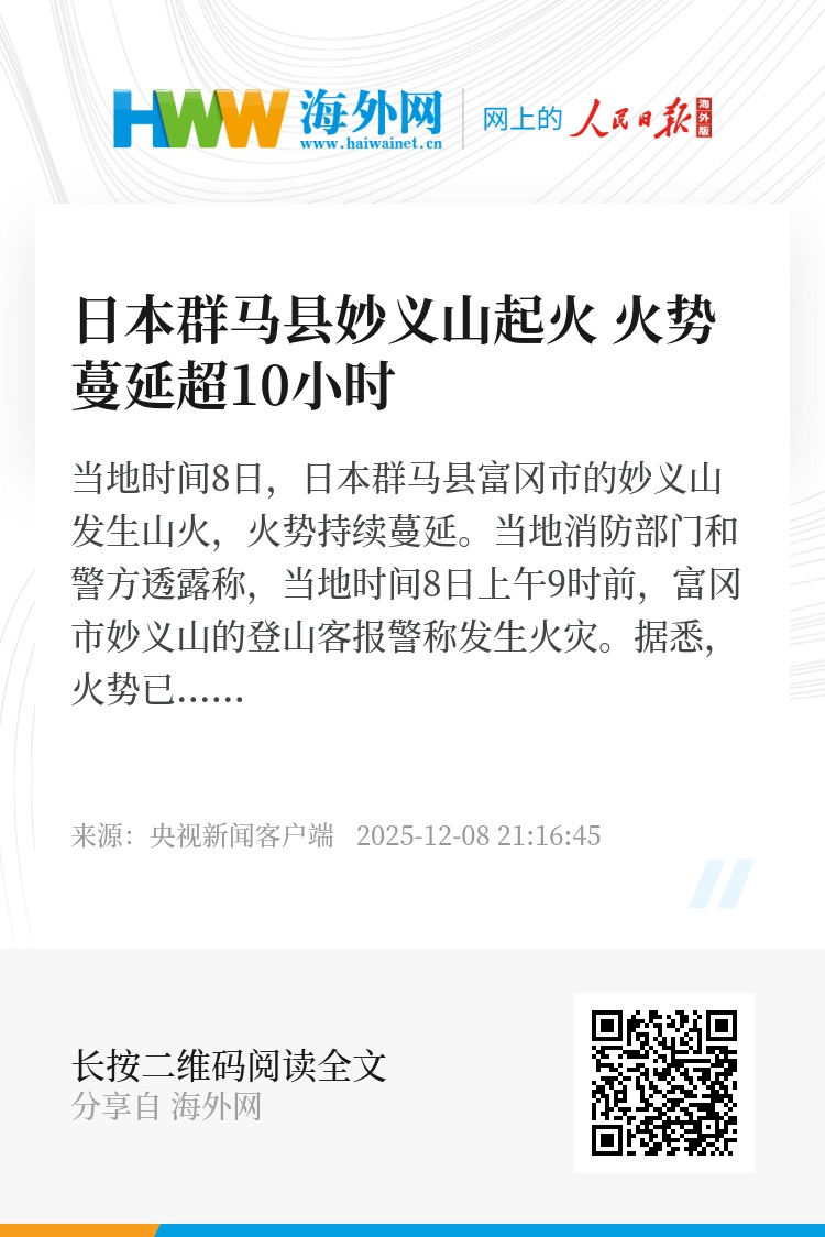 当地消防部门和警方透露称,当地时间8日上午9时前,富冈市妙义山的登山客报警称发生火灾。据悉,火势已持续蔓延超10小时。目前没有人员受伤或被困,民宅受损的可能性也较低。(总台记者 何欣蕾)