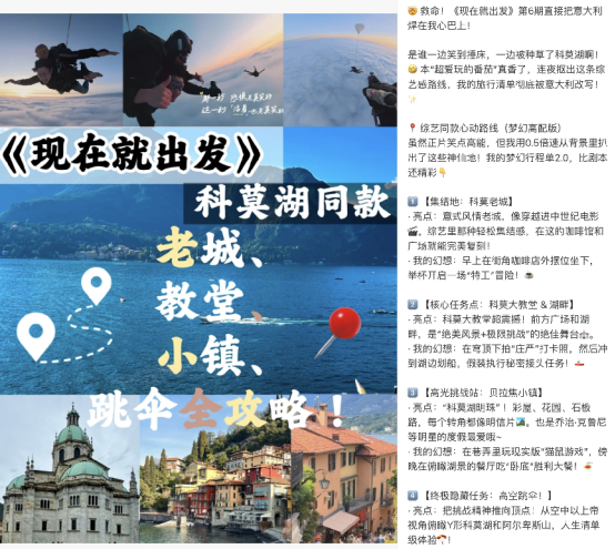 在意大利的环节设计中,节目组充分挖掘当地的文化名片。例如在阿尔卑斯山麓的科莫湖拍摄时,团队根据电影《007:大战皇家赌场》的取景背景,设计了嘉宾以“特工”造型亮相的入场情节;并以“特工需具备随时从天而降的能力”为灵感,将当集的最终挑战设定为“高空跳伞”,并在被誉为全球跳伞运动员理想场地的博洛尼亚完成这次燃情体验。节目将地域文化标签与游戏创意有机融合,形成贯穿整集的叙事逻辑,使观众在轻松观看中获得对不同文化的沉浸式“轻体验”。这一段趣味鲜明、情绪饱满的内容播出后,也成功吸引了众多网友“种草”科莫湖与博洛尼亚,成为连接观众与目的地的新触点。