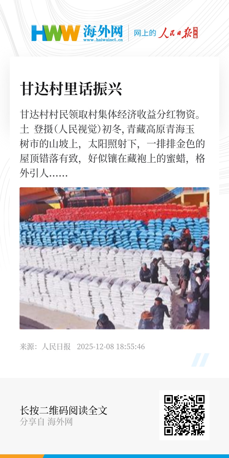 初冬,青藏高原青海玉树市的山坡上,太阳照射下,一排排金色的屋顶错落有致,好似镶在藏袍上的蜜蜡,格外引人注目,这就是甘达村。