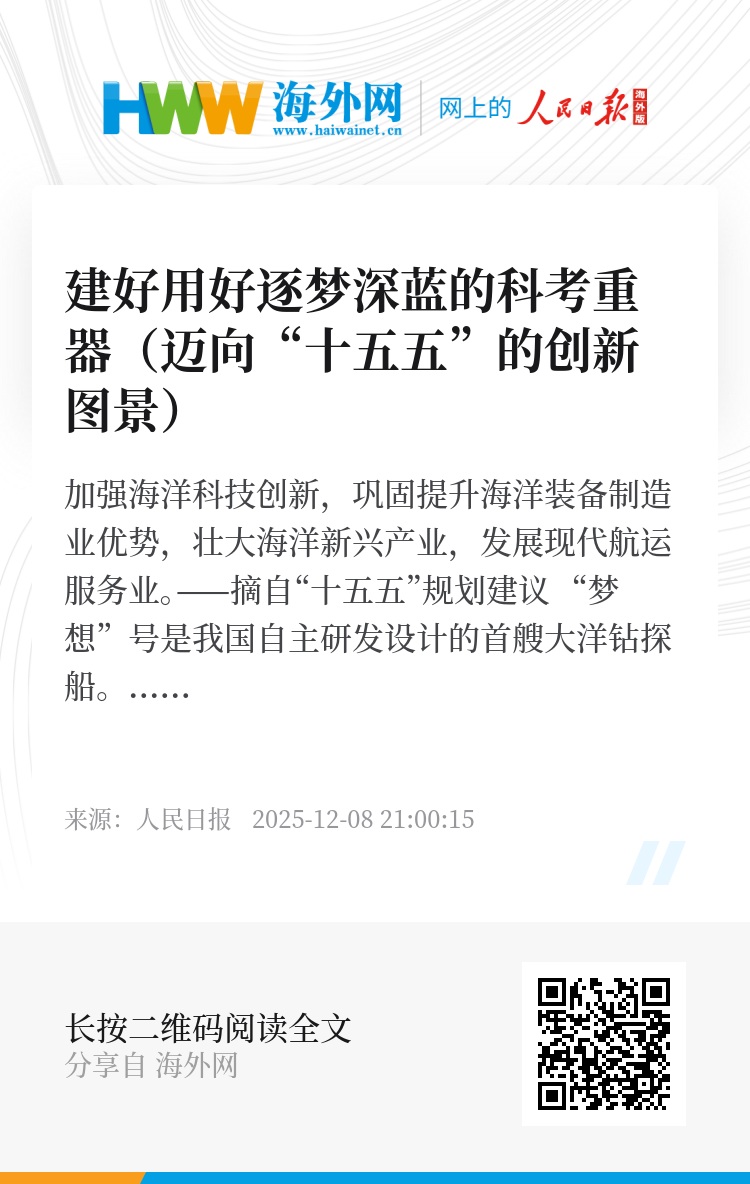 展望“十五五”,我们将持续创新,建好用好“梦想”号这艘逐梦深蓝的科考重器,按计划执行深海能源资源勘查和大洋科学钻探等工作任务,持续开展国际海洋合作,为更好地认识、开发和保护地球家园贡献力量。