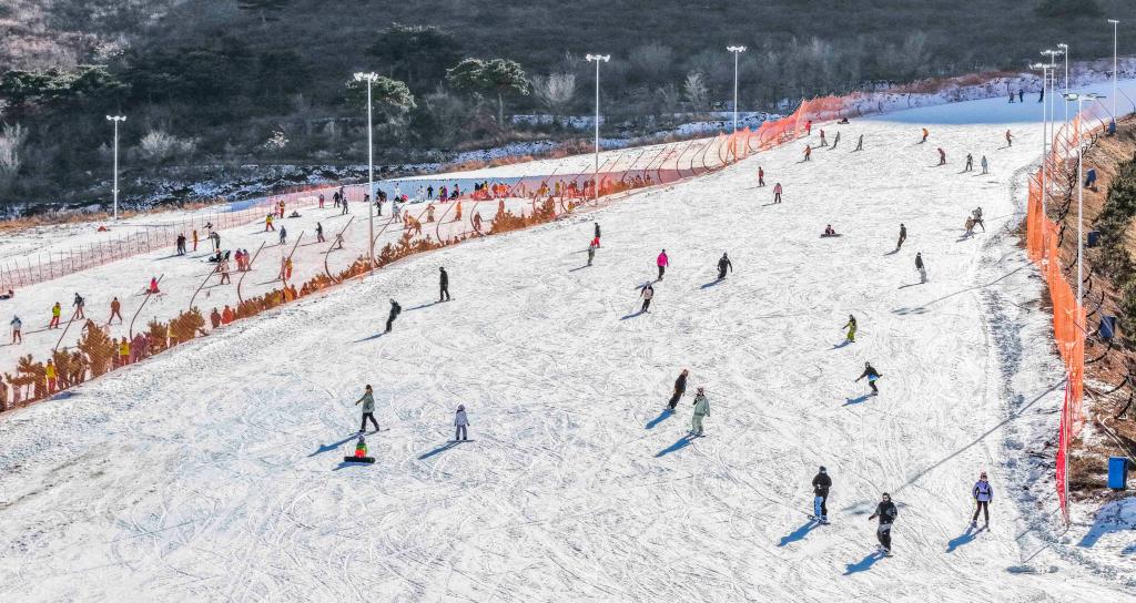 12月7日,游客在河北省唐山市玉田县玉龙湾滑雪场滑雪(无人机照片)。进入冰雪季节,多地滑雪场迎来客流高峰,人们在这里亲近冰雪,体验滑雪运动乐趣。新华社发(刘满仓 摄)