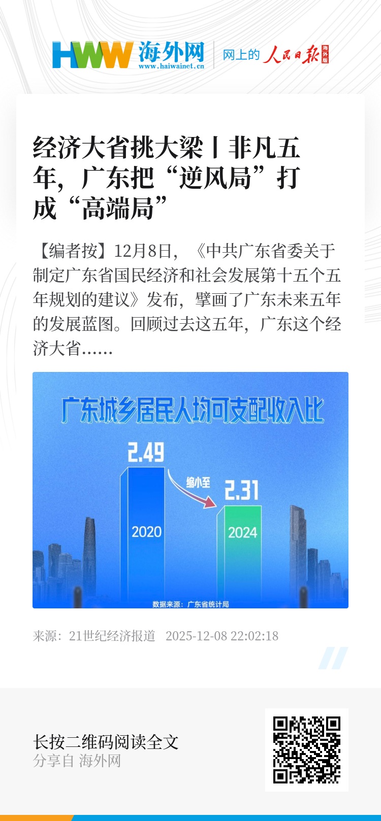 【编者按】12月8日,《中共广东省委关于制定广东省国民经济和社会发展第十五个五年规划的建议》发布,擘画了广东未来五年的发展蓝图。回顾过去这五年,广东这个经济大省迎难而上,在纷繁复杂的变局中增创新优势,实现新突破,为“十五五”时期进一步的转型发展奠定良好基础。广东过去五年具体做成了什么?未来五年的增量又在哪?本期经济名场面带你看: