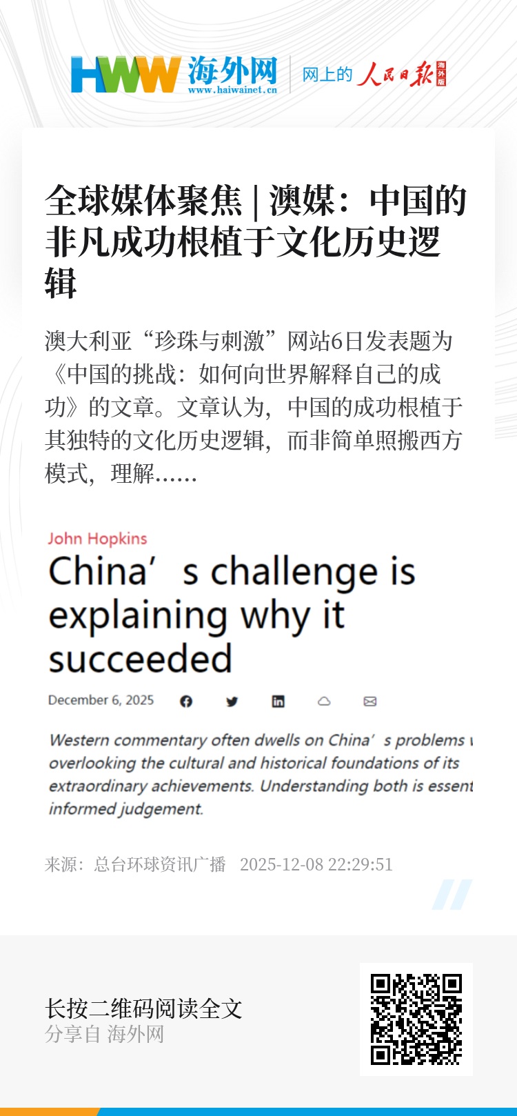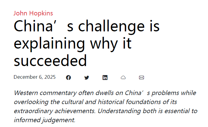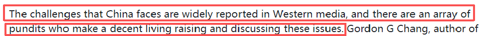 文章认为,西方媒体对中国的问题报道颇多,甚至许多专家靠分析和讨论这些问题谋生。而中国面临的挑战是:中国如何让世界理解过去50年取得的非凡成功?