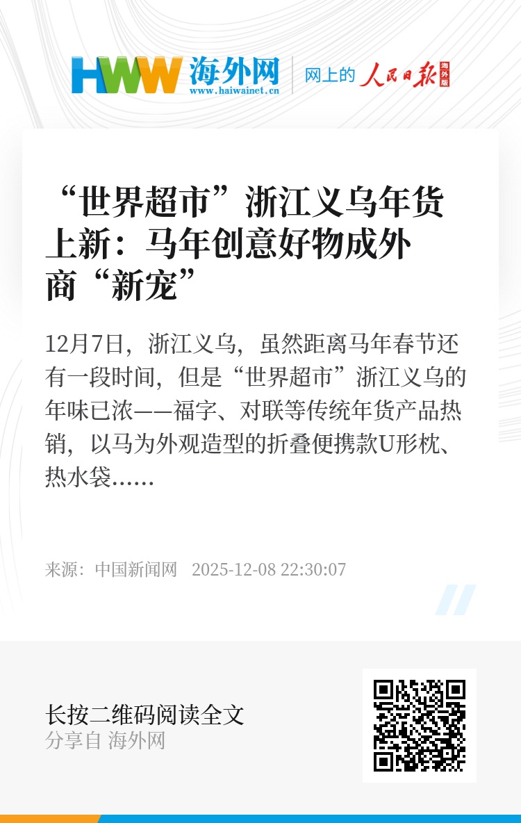 12月7日,浙江义乌,虽然距离马年春节还有一段时间,但是“世界超市”浙江义乌的年味已浓——福字、对联等传统年货产品热销,以马为外观造型的折叠便携款U形枕、热水袋等不少创意好物也登上店铺“C位”,成为“销冠”。(董易鑫 刘子琳)