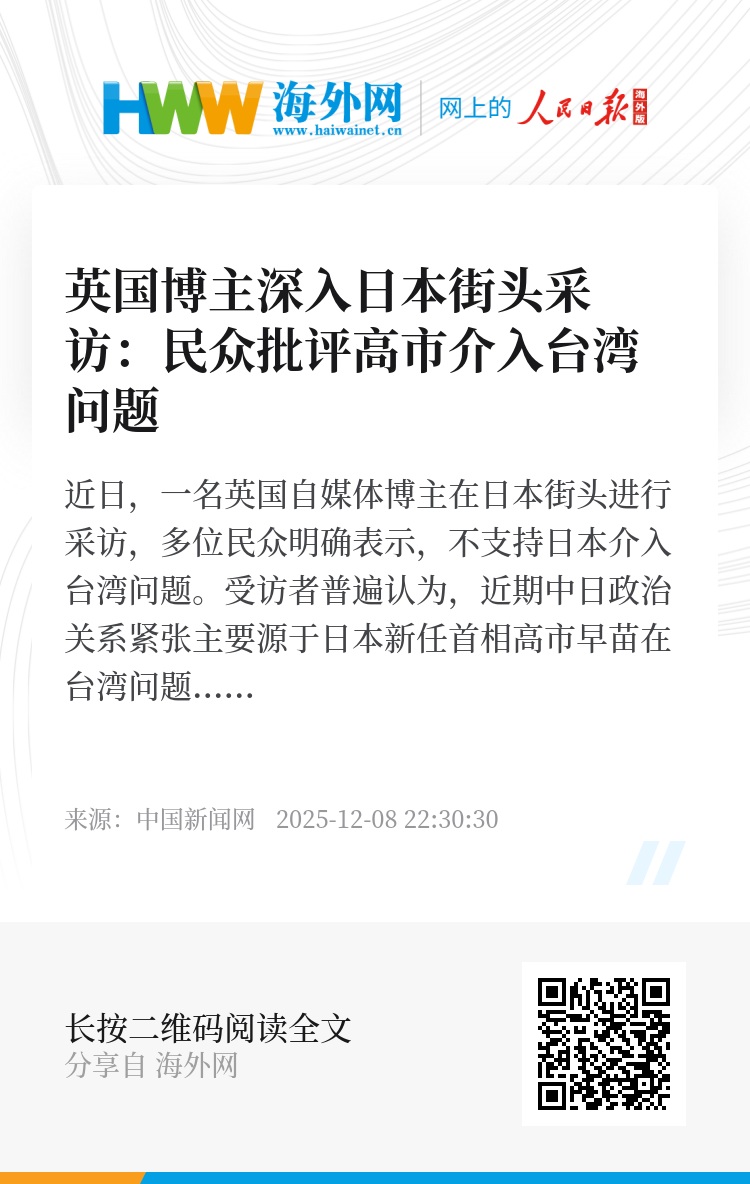 近日,一名英国自媒体博主在日本街头进行采访,多位民众明确表示,不支持日本介入台湾问题。受访者普遍认为,近期中日政治关系紧张主要源于日本新任首相高市早苗在台湾问题上的不当言论,但不少人强调这并不影响他们对中国的好感,许多人都提到中国人友好、热情,中国历史文化深厚。