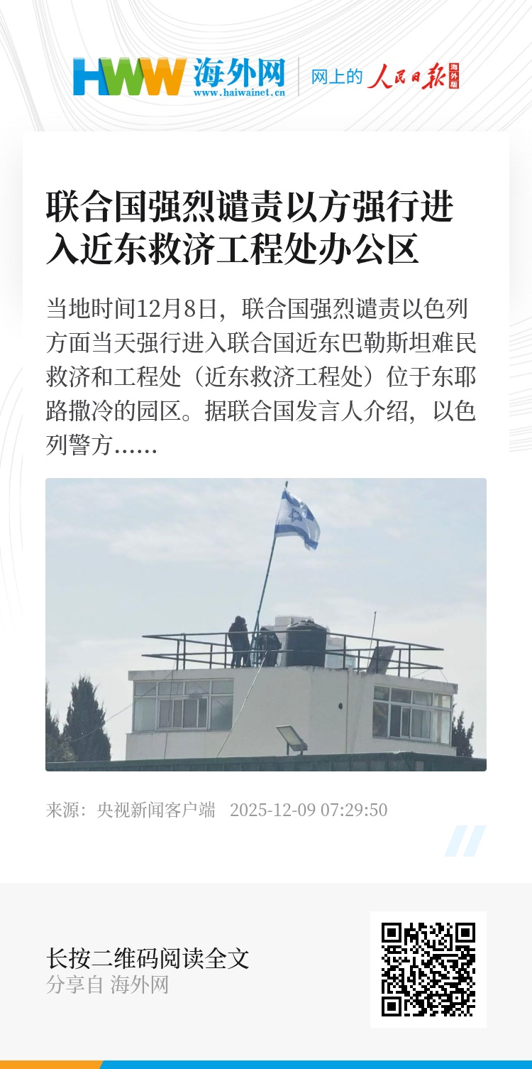 当地时间12月8日,联合国强烈谴责以色列方面当天强行进入联合国近东巴勒斯坦难民救济和工程处(近东救济工程处)位于东耶路撒冷的园区。