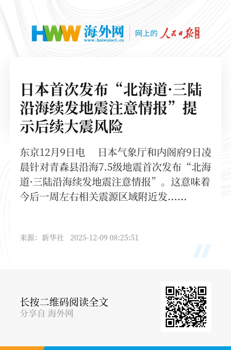新华社东京12月9日电 日本气象厅和内阁府9日凌晨针对青森县沿海7.5级地震首次发布“北海道·三陆沿海续发地震注意情报”。这意味着今后一周左右相关震源区域附近发生大地震的概率高于平时。