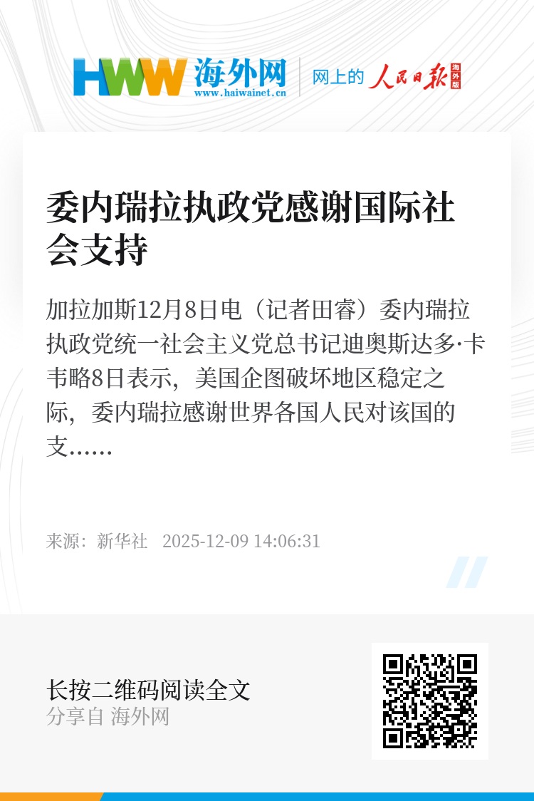 新华社加拉加斯12月8日电(记者田睿)委内瑞拉执政党统一社会主义党总书记迪奥斯达多·卡韦略8日表示,美国企图破坏地区稳定之际,委内瑞拉感谢世界各国人民对该国的支持。